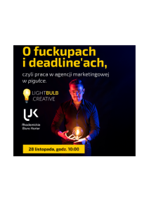 Wydarzenie ,,O fuckupach i deadline’ach, czyli praca w agencji marketingowej w pigułce’’. nie odbędzie się w tym terminie. Więcej informacji o wydarzeniach znajdziecie na stronie organizatora.