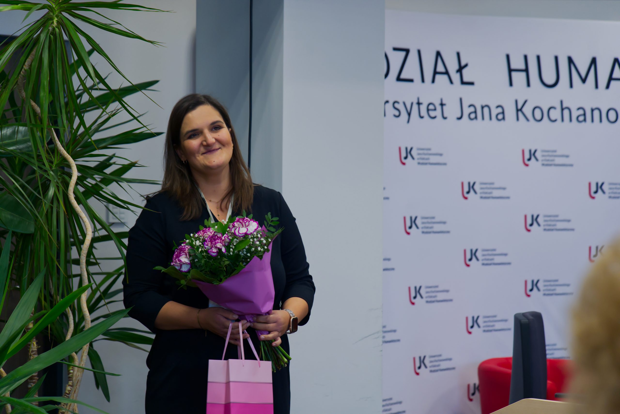 - Mgr Natalia Walkowiak z kwiatami w rękach i torbą prezentową