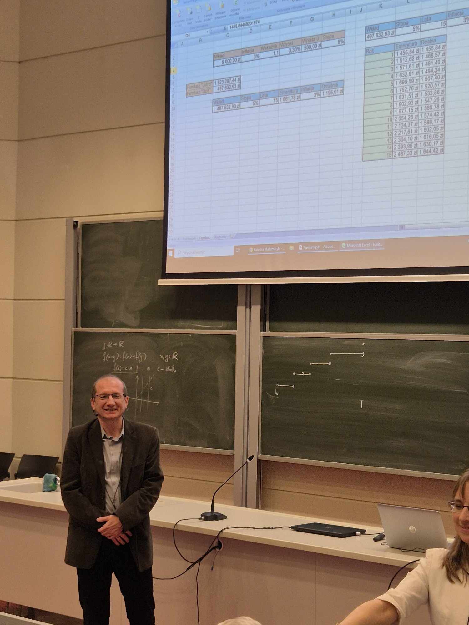 Doktor Habilitowany Wojciech Jabłoński (Katedra Matematyki Uniwersytetu Jana Kochanowskiego) zabrał nas w podróż do przyszłości. Przybliżony został temat wartości kapitalizowania, a na podstawie przygotowanego wzoru i założeń, które obejmowały nawet inflację, mogliśmy przekonać się o wartości potencjalnych oszczędności za czterdzieści lat.