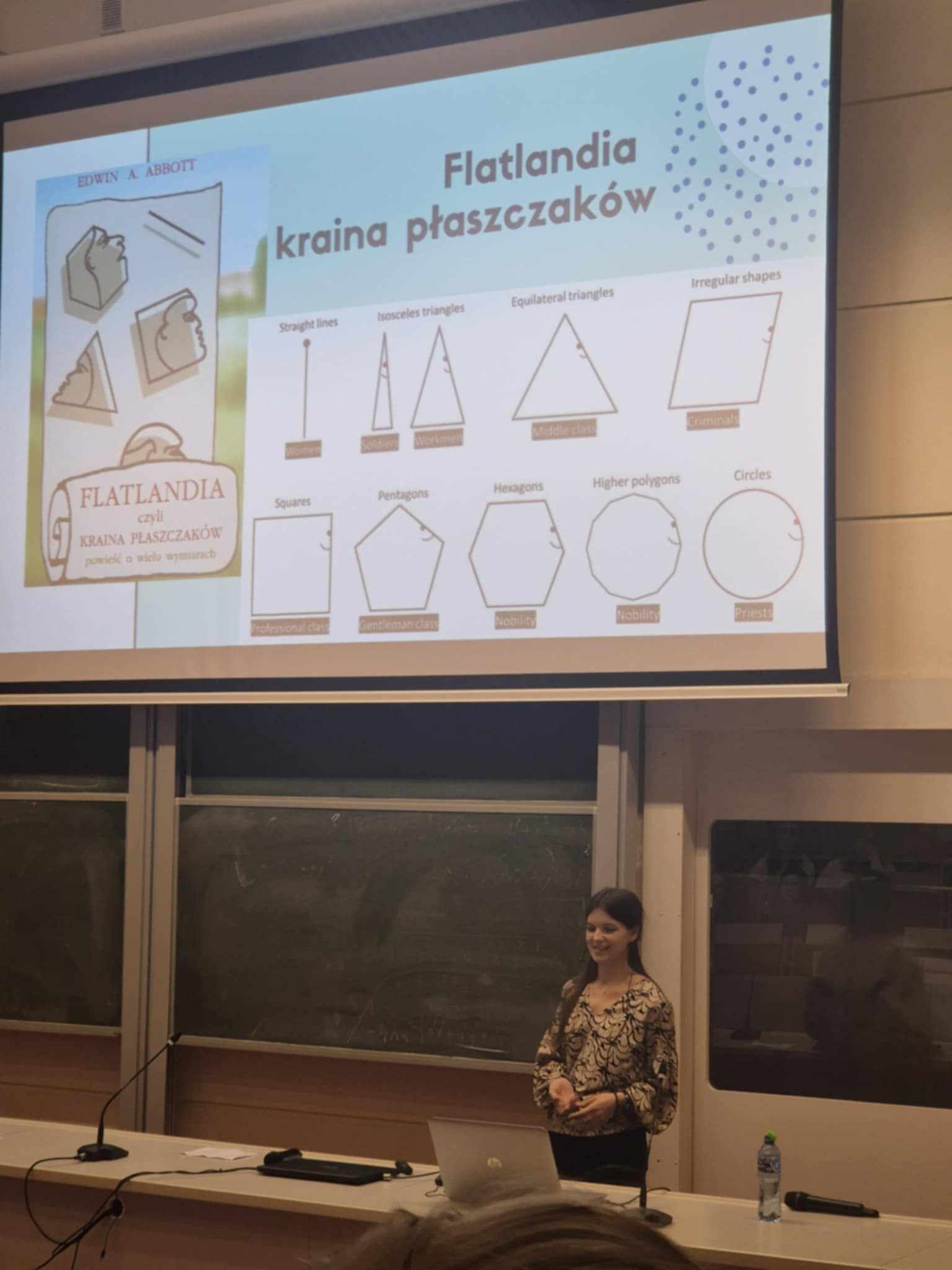 Dzięki mówczyni, przenieśliśmy się do Flatlandii- krainy płaszczaków, która w nieco zabawny sposób przybliżyła nam teorię wymiarów.